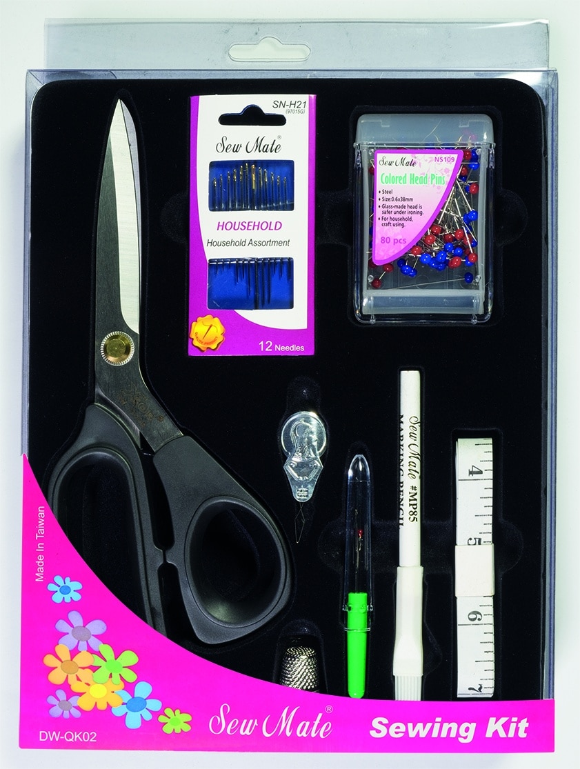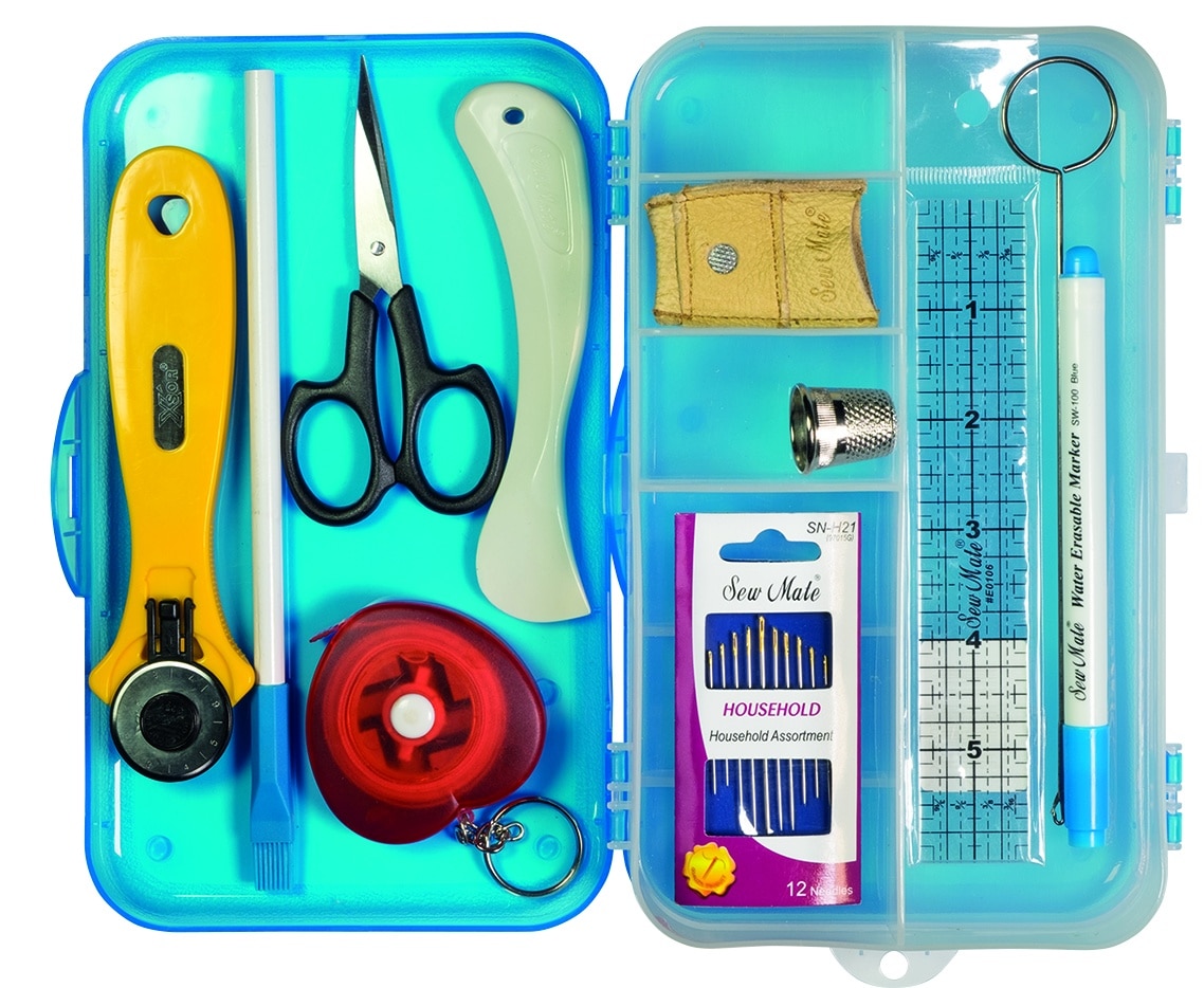Estuche de plástico con elementos básicos para la costura: Tijeras, alfileres, agujas de costura, lápiz con cepillo de plástico, cinta métrica, enhebrador de aguja, dedal metálico y abridor de ojales.